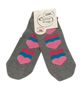 Skarpetki dla dziewczynki, szare z różowymi i niebieskimi sercami na przodzie.