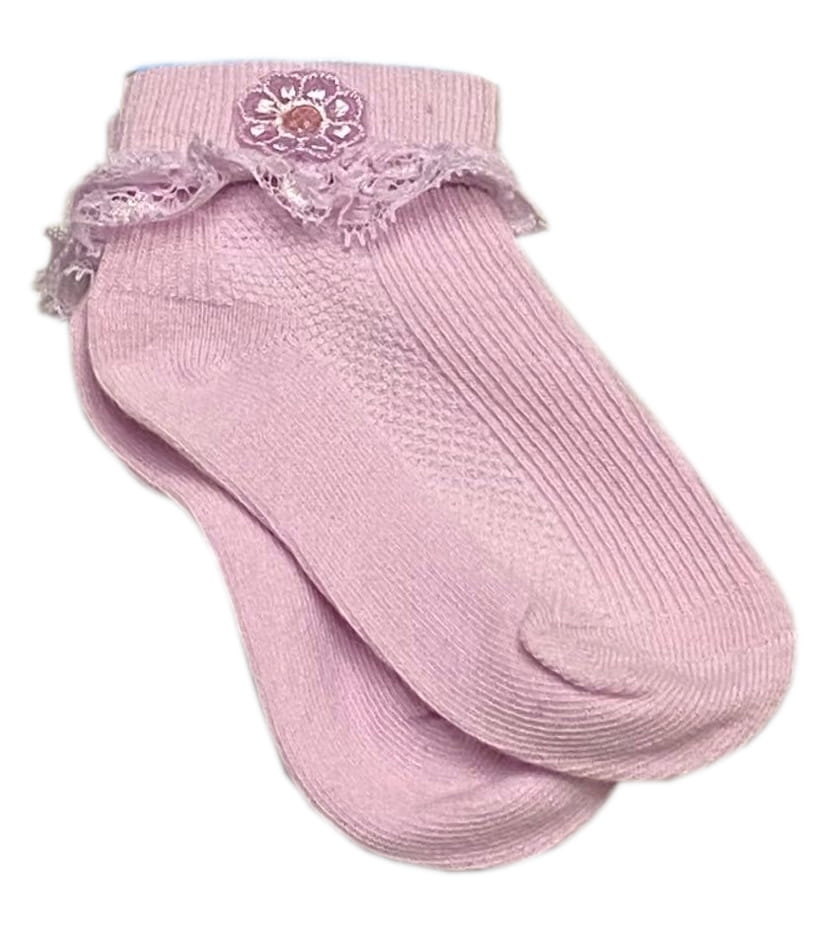 Skarpetki dziecięce polskiej marki Yo. Skarpetki dla małej dziewczynki. Skarpetki są różowe, z lekko ażurowym wzorem i koronkową falbanką poniżej ściągacza.