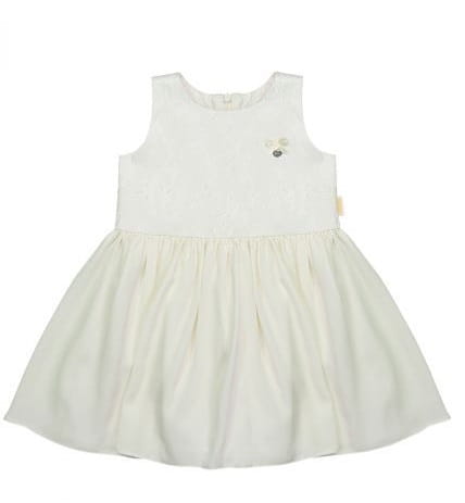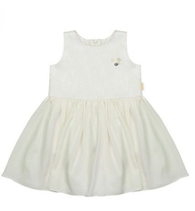 Cudna sukieneczka dziewczęca bez rękawów, u góry biała, z gęstej żakardowej gipiury, a poniżej karczka jasno kremowa (ecru) i marszczona. Na piersi maleńka, złota przywieszka. Cała sukieneczka jest na cienkiej bawełnianej podszewce. Zapinana jest z tyłu do pasa na suwak.