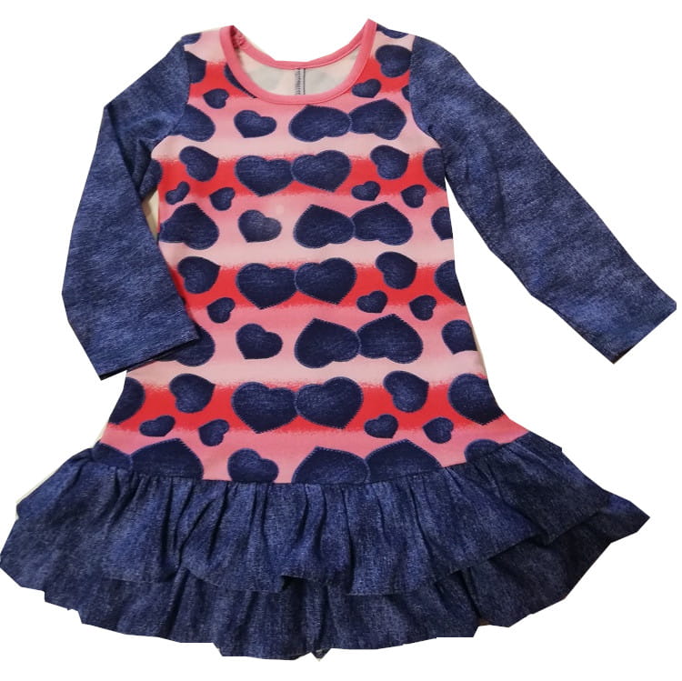 Sukieneczka dziewczęca z długim rękawem polskiej firmy Sarum. Sukienka ma dół i rękawy w kolorze granatowego jeansu, natomiast góra jest w szerokie ciemno i jasno różowe pasy, na których są granatowe serduszka. Pod szyją sukienka jest gładko wykończona różową lamówką. Stan sukienki jest lekko obniżony, a poniżej są dwie mocno marszczone, granatowe falbany. Bardzo twarzowa kolorystyka.