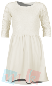 Śliczna sukieneczka w jasnym, kremowym kolorze polskiej firmy MK Golińscy. Sukienka jest odcinana w pasie, poniżej marszczona. Dół ma lekko przedłużony i zaokrąglony. Przód jest podwójny, zewnętrzna warstwa z ozdobnej koronki. Rękawy o długości 3/4 są koronkowe.
