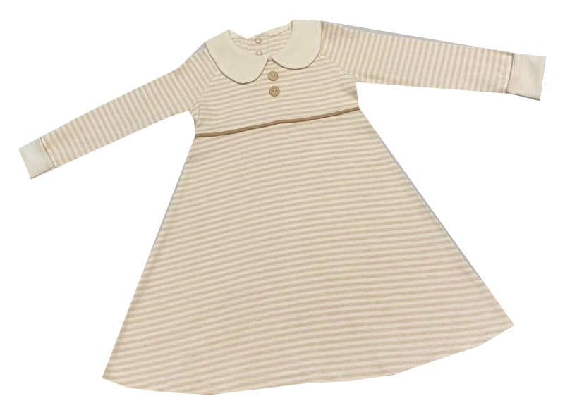 Mięciutka sukieneczka z długim rękawem polskiej firmy Beloved. Sukieneczka jest w paseczki w delikatnych odcieniach beżu. Uszyta jest z bawełny organicznej, naturalnie barwionej, beż użycia barwników. Kolorystyka sukienki nawiązuje do naturalnych barw Ziemi, gdyż takie tylko barwy są możliwe do uzyskania w sposób naturalny z bawełny organicznej, bez użycia barwników. Co istotne kolory po każdym praniu stają się bardziej wyraziste i mocniejsze.