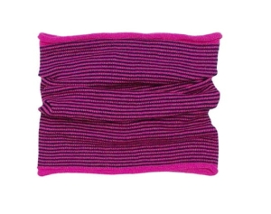 Komin dziewczęcy - tuba polskiej firmy AJS. Komin jest w cienkie, różowe i czarne paseczki i ma różowe zakończenia. Z boku, przy szwie jest mała, firmowa wszywka.