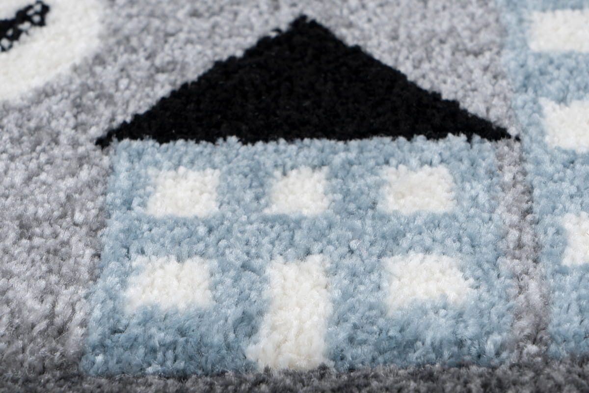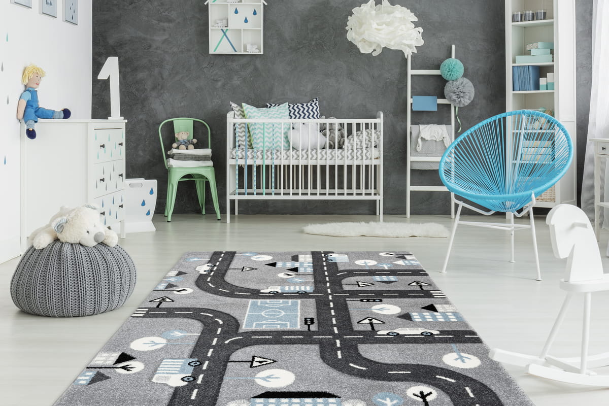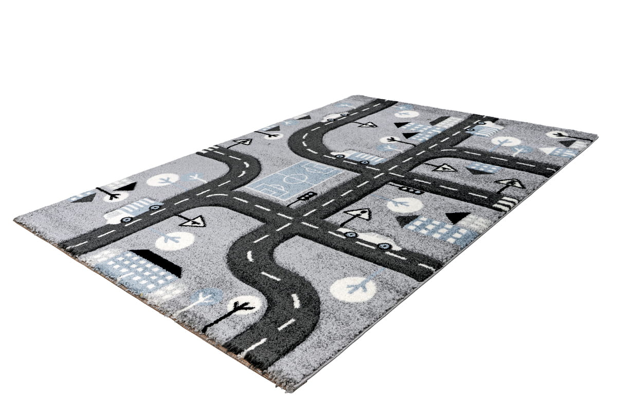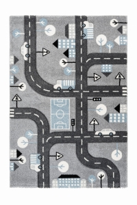 Przeuroczy, mięciutki i wytrzymały, syntetyczny dywan o średniej długości włosiu w rozmiarze 80 x 150 cm przeznaczony do dziecięcego pokoju. Dywan ozdobiony jest zabawnym, przyjaznym dla dziecka motywem uliczek i miasta w subtelnej szarej kolorystyce.
