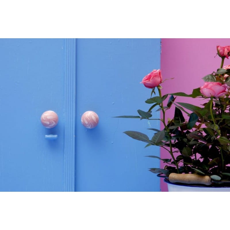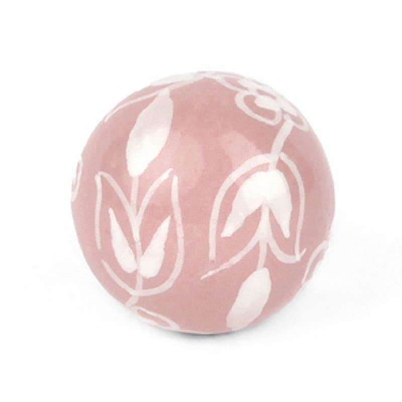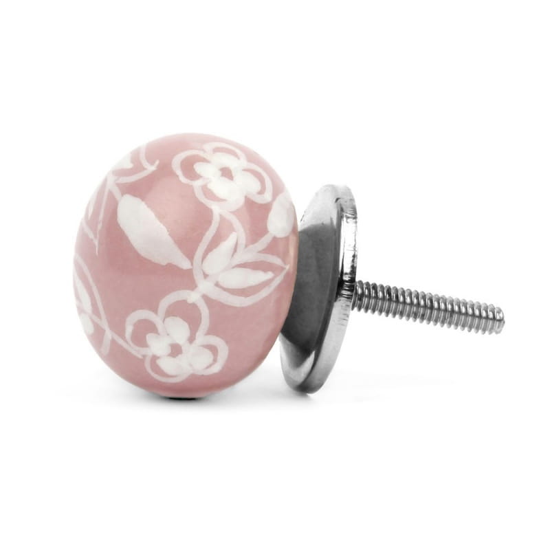 Różowa kulka w kwiatki – ręcznie wykonana ceramiczna gałka do mebli w różowym kolorze z motywem białych kwiatów.