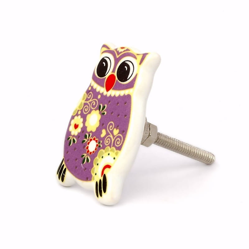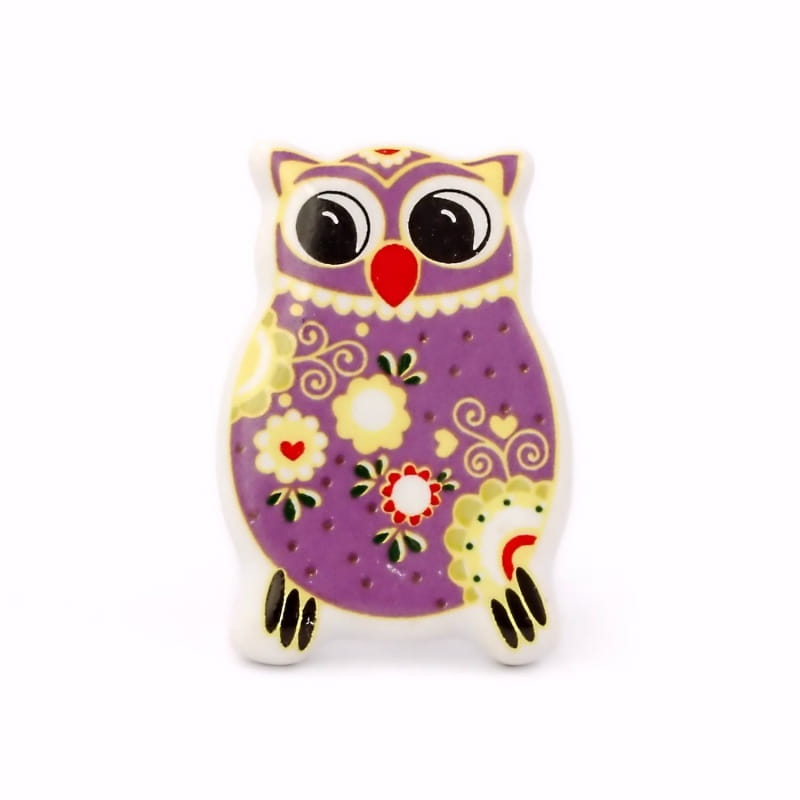 Sówka fioletowa – ręcznie wykonana z ceramiczna gałka do mebli w kształcie uroczej sowy w kolorystyce biało-fioletowej.